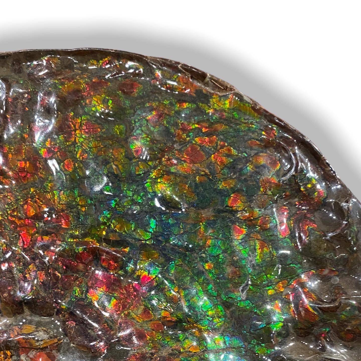 A very well preserved fossil that has with shell patterns displaying Ammolite gemstone. This fossil has one side predominantly green and blue, with the other side predominately red and green. The contrasting sides of this fossil allows you to change the energy of a room by deciding which side to display.