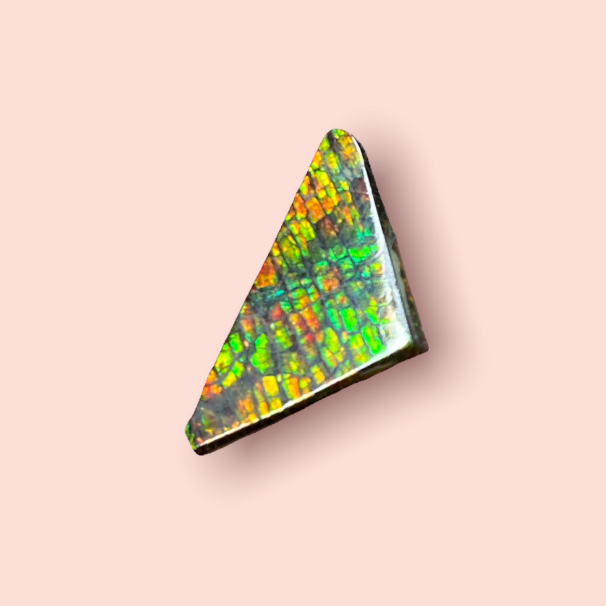 Beautiful one of a kind tri-color ammolite gemstone. This Dragon Skin texture displays brilliant colors of Green, and Orange with REd spots.