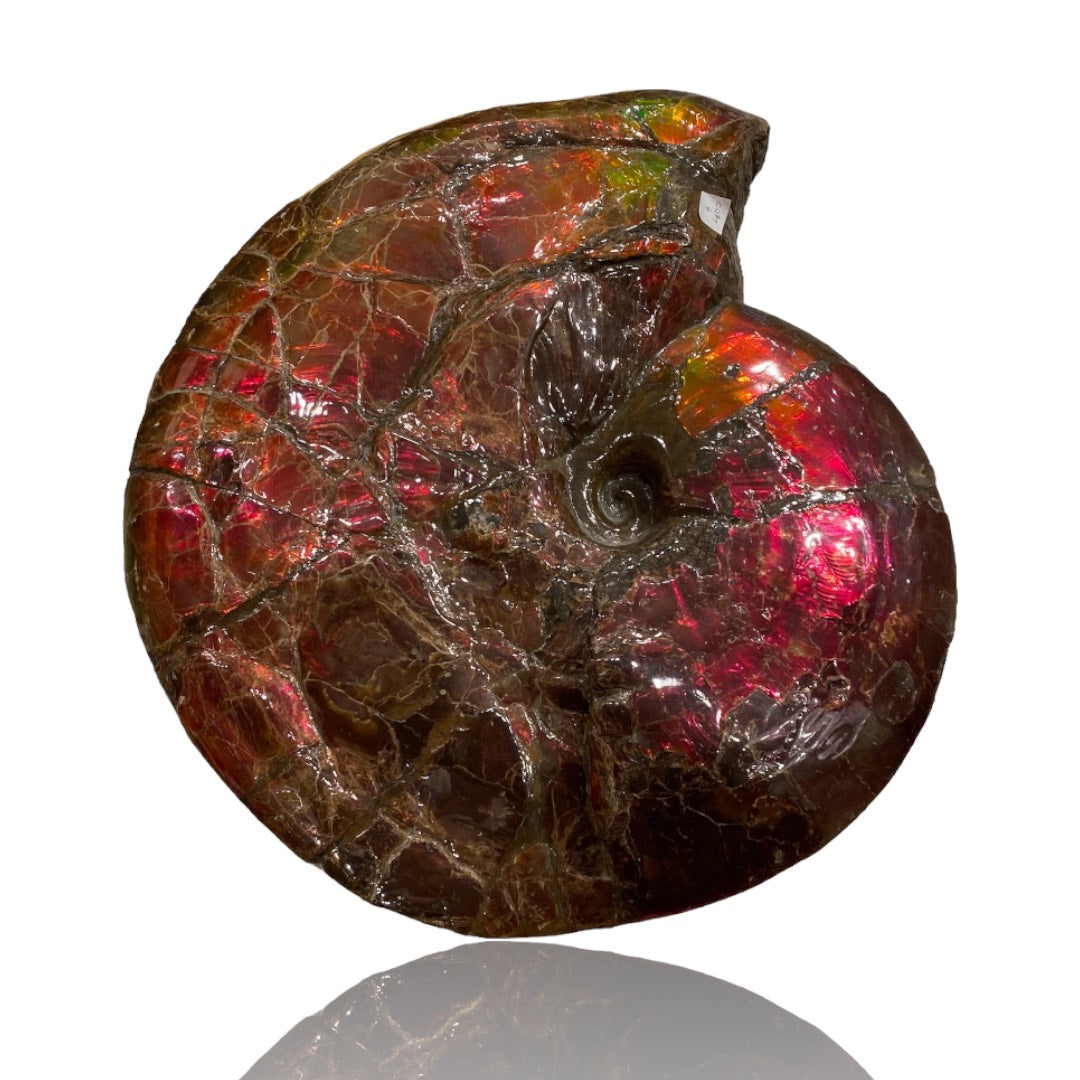 The largest Ammolite fossil in our collection, this enormous Ammonite measures 56cm in diameter and will naturally be the focal point of any collection. The sheer size of this fossil makes it impossible to keep the eye from returning to it. It is extremely bold, sturdy and dependable with distinct suture fossilization covered in deep red, green and gold tones.